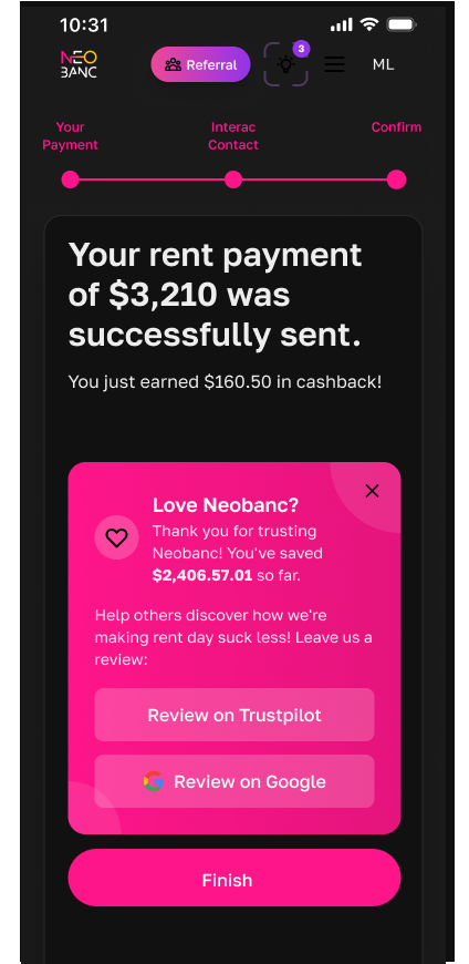 Also, if the payment doesn’t go through Neobanc, you won’t earn cashback for that rent payment. In the event you send the funds late, we may be able to process the payment on time (but at the cost of cashback) - this is never guarenteed.